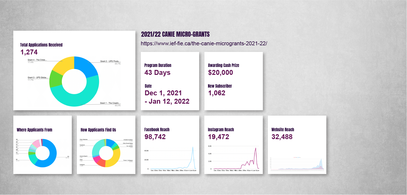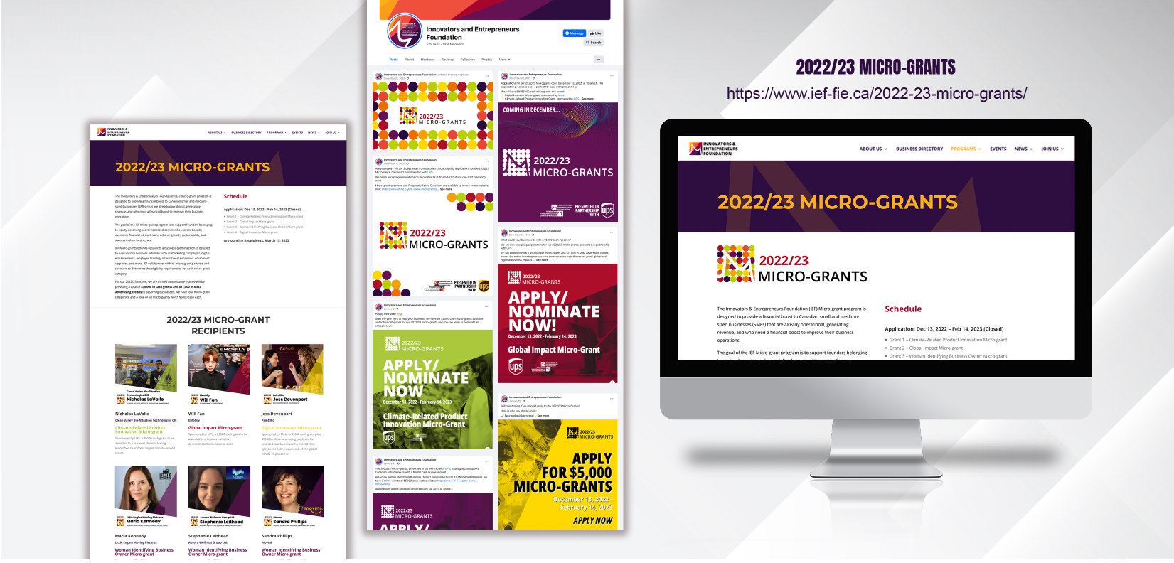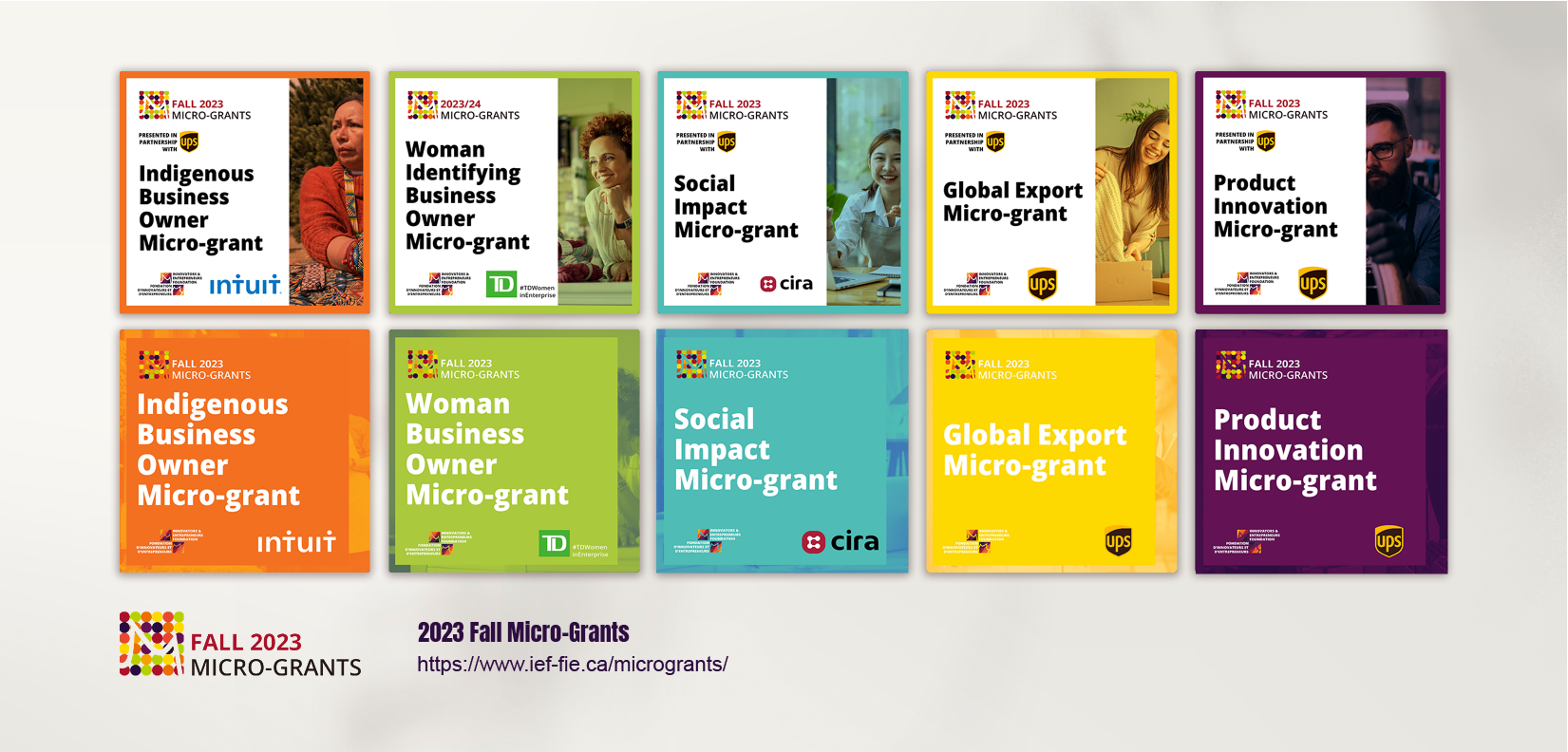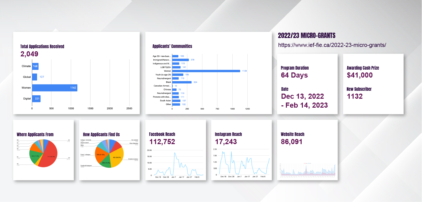 Informed by the distinctive brand tone of the IEF, a national charity dedicated to supporting founders from racialized and/or equity-deserving groups, our design process aligns harmoniously with the foundation’s 12 theme colors, each symbolizing different communities served. The initial stages involve crafting an annual logo and a versatile theme image. We then proceed to create fundamental graphics for each grant category, employing colors associated with the unique characteristics of each category.