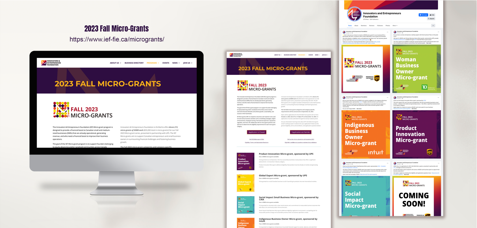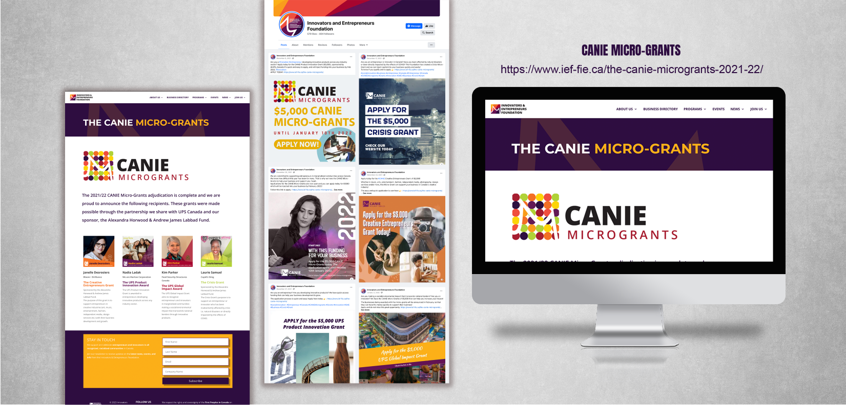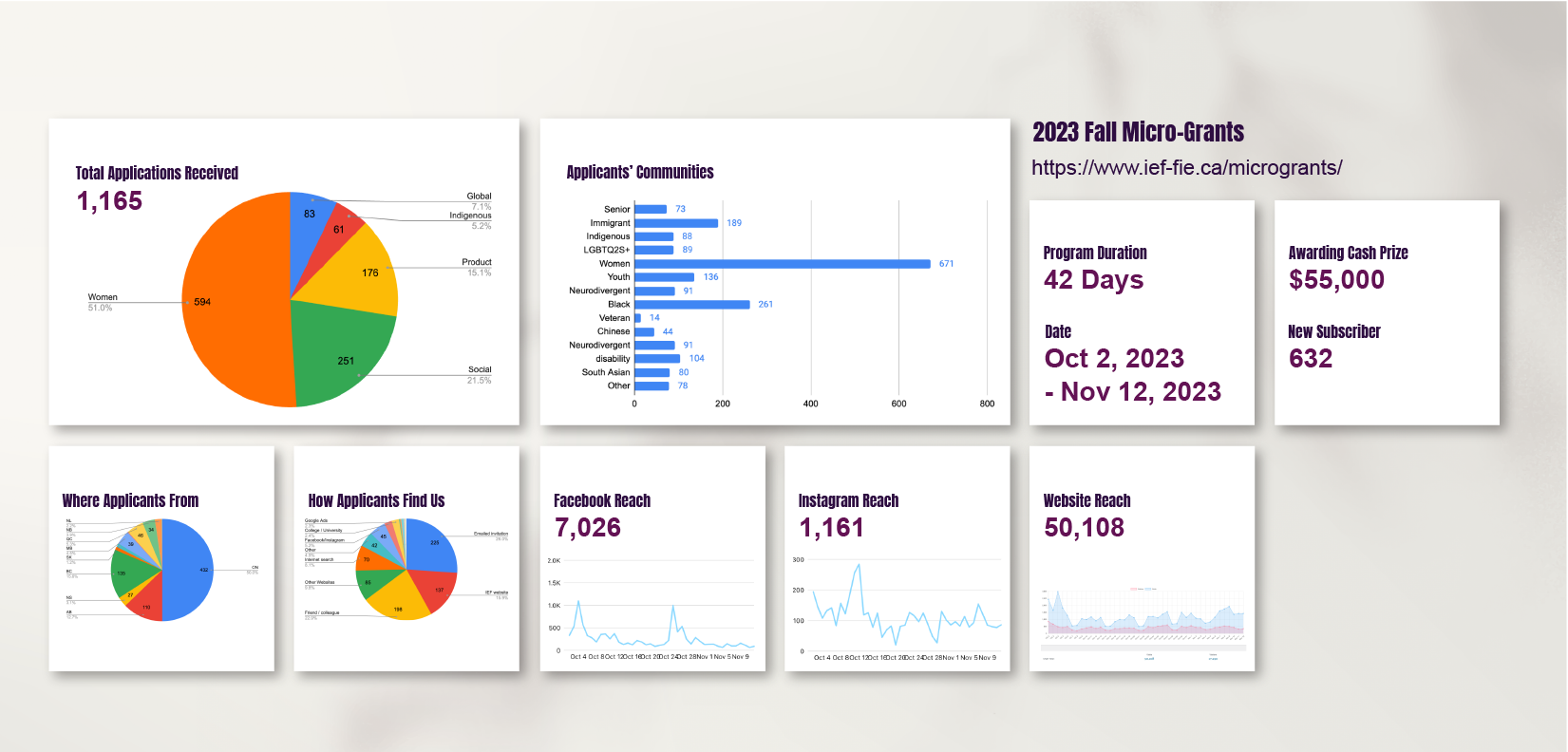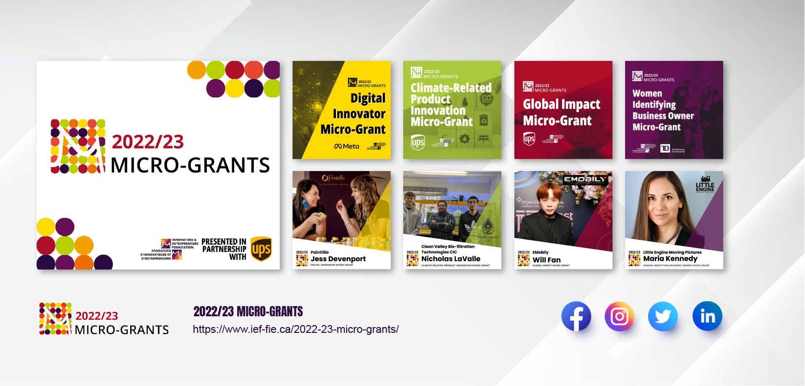 Informed by the distinctive brand tone of the IEF, a national charity dedicated to supporting founders from racialized and/or equity-deserving groups, our design process aligns harmoniously with the foundation’s 12 theme colors, each symbolizing different communities served. The initial stages involve crafting an annual logo and a versatile theme image. We then proceed to create fundamental graphics for each grant category, employing colors associated with the unique characteristics of each category.